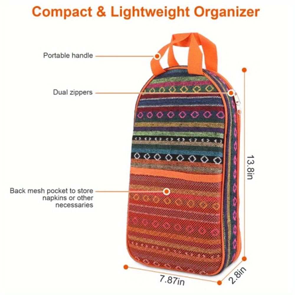*Compact & Lightweight*:This utensil kit comes with a portable polyester organizer that neatly keeps your utensils in one place and protects all cutlery from being damaged in case of a fall. With a size of 13.8x7.87x2.8in,this utensil kit is ideal for stowing in the backpack. Besides,the contemporary multi-color pattern of the bag adds a vibrant splash of color to your spread.