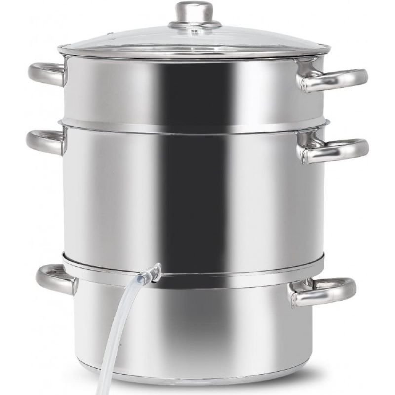 This steamer is used for extracting the natural juice from high liquid fruits or vegetables. It is easy to operate. You just need to place fruits or vegetables inside the top colander and boil water in the bottom pot and then concentrate juice drips into the center juice kettle. The juice can be used for making various jelly; syrup; nectar; or to being stored as concentrate.